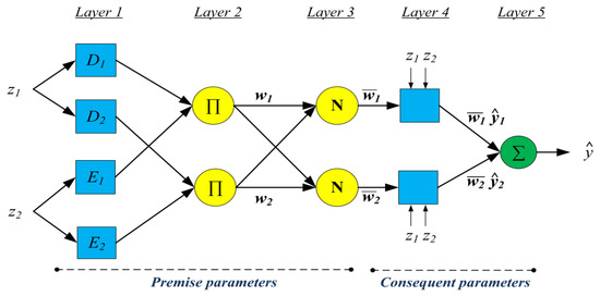 ANFIS is explained by assuming two input variables ( and ) and a unique output variable (). The rule illustrating the relationship associating the input, the membership function, and the output can be expressed using the if–then TSK fuzzy rules illustrated in the following conditional statements [25]: