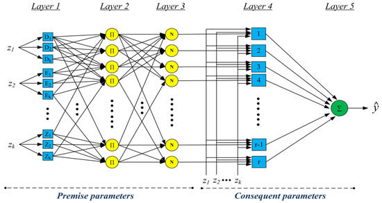 As illustrated in Figure 2, the ANFIS architecture uses five layers relying on Takagi–Sugeno–Kang (TSK) rules inference system. Each layer carries out distinct functions. There are five layers: the fuzzification layer, rule reasoning layer, normalization layer, defuzzification layer, and output layer. The premise and consequent parameters are the essential parameters of ANFIS. The premise parameters {, , } are included in the designed membership functions of the fuzzification layer, which is the input layer of the ANFIS network used to generate input spaces by retrieving patterns in the input data. The consequent parameters {, , } correspond to the parameter sets of the defuzzification layer.