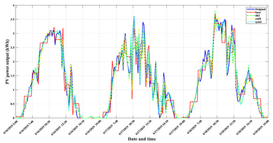 The performance of the wavelet-ANFIS model for various wavelets mother functions for the input datasets is computed. Figure 6 shows the PV output of the original in blue compared with the wavelet output with different mother functions (Haar, Daubechies(db3), coiflets (coif2), and symlets (sym4)). Table 2 shows the forecasting result with different wavelet mother functions. It is discernible from Table 2 that wavelet-ANFIS models using coif2, sym4, and sym6 were more highly accurate than the other mother wavelets. The wavelet-ANFIS models with sym4 gave the highest efficiency in an overall view, indicating that wavelet decomposition utilizing the mother wavelet, sym4, can noticeably enhance ANFIS forecasting models’ accuracy compared with other mother wavelets functions. It should be mentioned that the value of Table 2 is the average value computed from 30-time differently shuffled data points to have a strong comparison.
