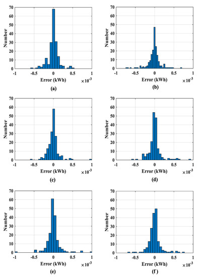 For more investigation, the comparison between wavelet-ANFIS and ANFIS that is presented in Table 3 indicates that the 10, 30, and 60 min for the ANFIS model with 12 input patterns forecasting RMSE are, respectively, equal to 6.3196 × 10−4, 8.5144 × 10−4, and 1.0610 × 10−3 kWh, which are about 3.38, 4.04, and 4.70 times higher than the wavelet-model, separately. Meanwhile, the RMSE for the previous scenarios with 18 input patterns using the ANFIS model yielded, respectively, results about 3.90, 3.66, and 4.67 times the RMSE higher than the wavelet-ANFIS model RMSE for the exact same scenarios. From Figure 7, which illustrates the error distribution of the ANFIS and wavelet-ANFIS model, it can be observed that the 10, 30, and 60 min forecasts using wavelet-ANFIS model have more error-index computations in (18) close to zero.