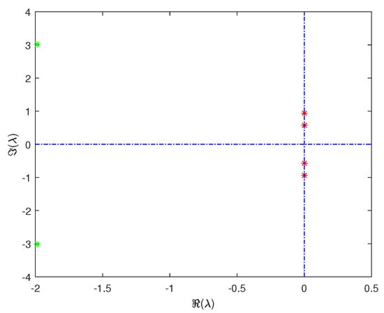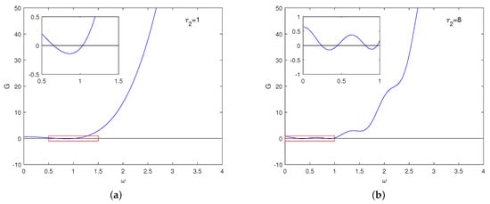 For example, we choose , where the roots of function G are related to , and the figures of function G are displayed in Figure 1 for different . Correspondingly, in Figure 2a and Figure 3a, we show the eigenvalue diagram of the system when changes. Figure 2b,c and Figure 3b show the real and imaginary parts of the eigenvalues when are fixed.