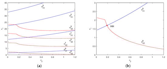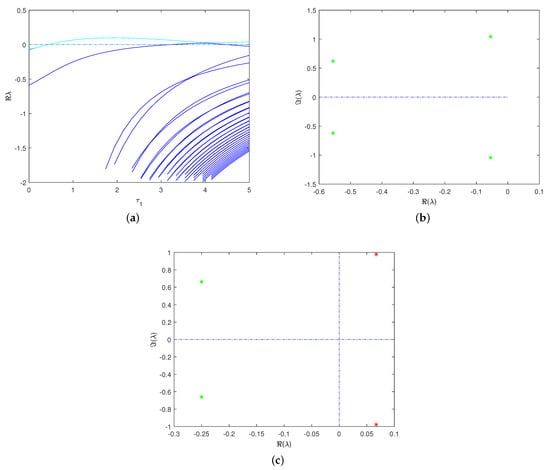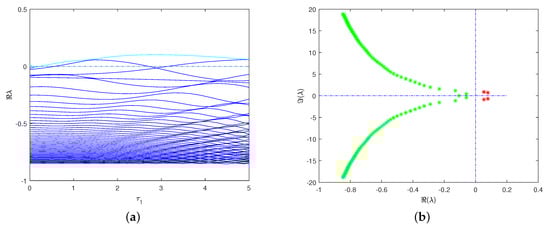 When , has two positive real roots, it means there will be an interval which makes the system stable. If separates from this interval, the stability of the system will change and the positive real part will appear, which can be observed in Figure 2a. When increases, the blue curve obviously crosses the zero line, then the blue curve falls from above the zero line. When , the situation becomes more complicated. has several positive real roots, and the stability switching of the system will be more frequent. It can be seen from Figure 3a that multiple curves of the system move back and forth on the zero line, and it illustrates the complexity of positive real characteristic roots.