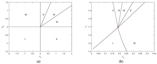 The value of the equilibrium point depends on in Equation (30). That is when changes near the critical value , and the stability of the equilibrium will change as well. We need to pay attention to the straight lines and , because there are different dynamic behaviors on both sides of them. At this time, the neighborhood of is divided into several parts, including region :