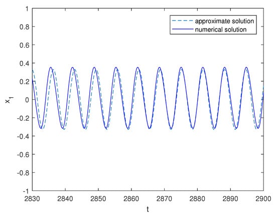 Due to the instability limit cycle generated by the system, the Runge Kutta method could not be calculated for numerical simulation in the case. Therefore, we could deduce the approximate analytical formula of the limit cycle of the System (2) by . Figure 8 shows the comparison between the approximate analytical formula (red) and numerical solution (blue). It can be seen that when the parameter is closed to the bifurcations of double Hopf, the approximate solution is in good agreement with the numerical solution. It is worth noting that the accuracy of the approximate solution of the system will decrease rapidly when the parameter selection is far away from the double Hopf bifurcation point. When , the approximate analytical solution of can be expressed as follows: