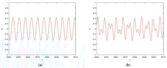 Through the phase diagram and time history diagram in Figure 9, it is found that the system is locally asymptotically stable in Region I. With the change of delay , the equilibrium point loses its stability because of the supercritical Hopf bifurcation, and a stable limit cycle appeared in Region VI. Note that the system periodically oscillates with . When the system is in Region II, the equilibrium point loses its stability again, and it was caused by a subcritical Hopf bifurcation and produced an unstable limit cycle. The system oscillates at . However, in Area IV, the system is affected by two frequencies, (Figure 10b). Due to the unstable limit cycle, it is impossible to simulate the system numerically, so an approximate solution of the system is given by