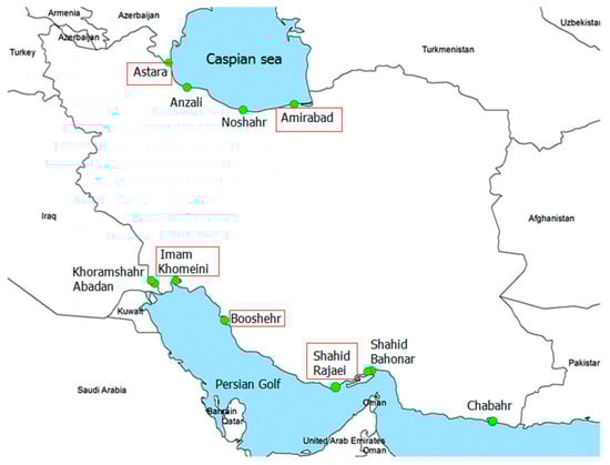 According to studies and additional information, the ports of Shahid Rajaei, Imam Khomeini, Bushehr, Amirabad, and Astara are the country’s five main and busiest ports, and are special economic zones. The provinces of Hormozgan, Khuzestan, Bushehr, and Mazandaran are located in Gilan Province. It should be noted that the problem data set was collected using field studies by the researchers, which was then used for information processing. Figure 1 shows the location of each port on the map of Iran. In the following, each of the mentioned ports will be examined. Table 3 shows the alternatives and economic, environmental, and social sub-criteria of sustainability considered in this paper, along with their acronyms.