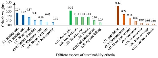 In this paper, the SWARA method was used to calculate the weight of each sub-criteria, and the results are shown in Figure 2. Based on the obtained results, loading and unloading (oil), pier length, and population were the most significant criteria in the economic, environmental, and social aspects of sustainability, as well as port capacity, aquatic fishing, and number of hotels. After determining the values of the weights for all criteria, the MARCOS, CoCoSo, and TOPSIS methods were used to rank and select the desired ports.