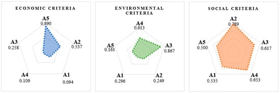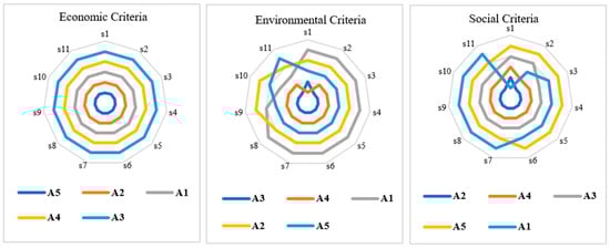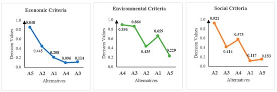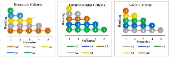This section of sensitivity analysis aimed to change the elements of the data matrix and re-evaluate the remaining alternatives. In each dimension of sustainability separately, the worst alternative was removed from the next review in each scenario. Therefore, firstly, we could understand the robustness of the solution obtained in uncertain conditions. Secondly, we could analyze the performances of the MARCOS model in the conditions of a dynamic initial matrix of decision-making in each aspect of sustainability. Generally, using the MARCOS method, the A5, A2, A1, A4, and A3 alternatives were ranked from first to fifth, respectively, using economic criteria, which generated the initial solution. According to the former results, A3 was the worst alternative. Therefore, it was removed in the first scenario. Thus, a new data matrix was created with four alternatives. The new solution was obtained based on the new data matrix: A5 > A2 > A1 > A4. According to new results, A5 remained the best, and at the same time, A4 was the worst alternative. Figure 9 shows the results for all aspects of sustainability.