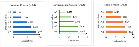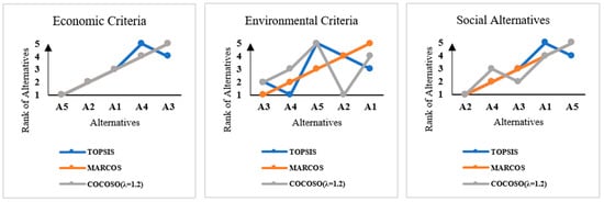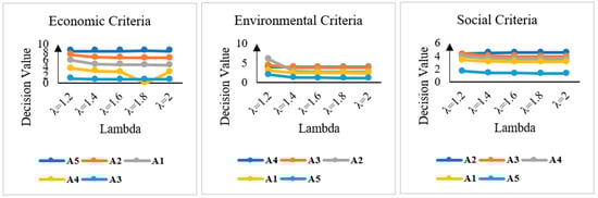 Figure 7 shows the results and the effect of parameter λ in the CoCoSo method. In this paper, the CoCoSo method was applied to solve the problem using different values of λ. As shown in Figure 7, the λ parameter in the CoCoSo method effectively ranked alternatives in all three dimensions of sustainability and changed the obtained results. Therefore, due to the complexity of estimating the value of this parameter in solving the problem and the proximity of the solutions of the MARCOS method to the CoCoSo method, it is suggested to use the MARCOS method for solving this type of problem.