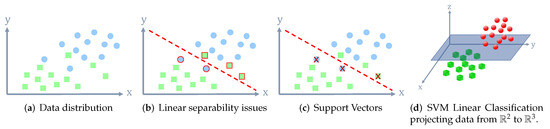 SVM linear classification. The final result presented in (d) illustrates how the circle data group is above the plane formed by the SVM. On the other side, the square data group is below the plane. (a) Data distribution; (b) Linear separability issues; (c) Support Vectors; (d) SVM Linear Classification projecting data from to .