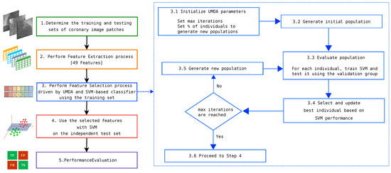 The proposed method is composed by several steps starting with the feature extraction task. This step transforms the X-ray images into a dataset formed by the defined features and their corresponding extracted values from each image patch. In the second step, a feature selection process is driven by UMDA, since the search space (the total number of combinations of selected and non-selected features) is computational complexity, which is not a suitable problem to be solved by an exhaustive strategy. In the final step, using the previously selected features, a SVM-based classifier is trained using the original feature dataset (removing unused features) and tested with new instances. The overall process is illustrated in Figure 3.