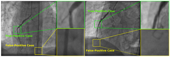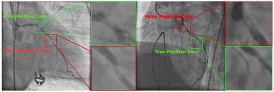Figure 6 illustrates two selected angiograms which include correct and incorrect classification results. In the first scenario, the classifier failed to detect positive stenosis cases since it labeled regions as negative when there were present stenosis cases. The remaining labeled cases were classified in a correct way.