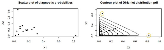Contour plots of the Dirichlet-gamma and Kummer–Dirichlet gamma distributions on diagnostic probabilities data.
