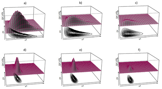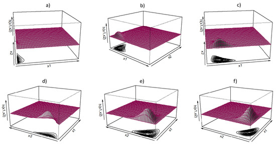 Example pdfs and contour plots for (10) for when (a) (0.1,2,2,2,2,2,2,2), (b) (2,2,2,2,2,2,2,2), (c) (4,2,2,2,2,2,2,2), (d) (0.1,2,4,2,1.5,2,1.5,−2), (e) (1,2,4,2,1.5,2,1.5,−2) and (f) (4,2,4,2,1.5,2,1.5,−2).