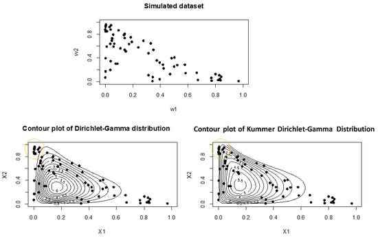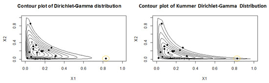 The results of Table 2 and Figure 6 illustrate that the Kummer–Dirichlet gamma distribution serves an alternative model for compositional data sets. Reference [12] illustrated that the Dirichlet-gamma is flexible in modeling compositional data sets; however, in this example, it is shown that the additional parameter adds flexibility, covering outliers where the Dirichlet-gamma distribution might not reach. The maximum likelihood value (), and the AIC and BIC measures also proves that the Kummer–Dirichlet gamma is a better alternative for this data set.