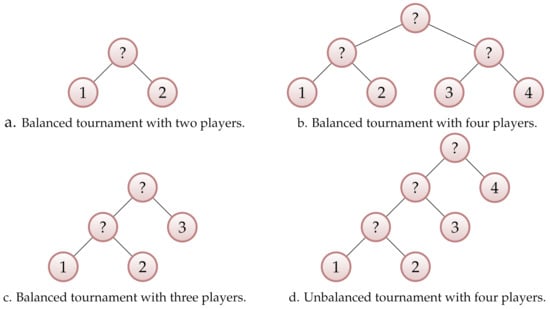 Some of the tournaments introduced in Example 1 are depicted graphically in Figure 1. Observe that the tournaments on the first row (labeled “a” and “b”) involve a number of elements that is a power of two ( and , respectively) and are fully balanced. However, the tournaments on the second row are not fully balanced, although the lower rightmost tournament involves players. However, intuitively, the tournament with three players (labeled “c”) should be accepted, as player 3 will enter the tournament only 1 round after players 1 and 2, i.e., it has a sense of “balancing”. However, the lower rightmost tournament with four players (labeled “d”) is not acceptable, as player 4 received an exemption from playing in the first two rounds, and this is considered unfair.