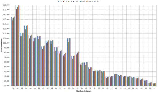 Sub-optimal tournament costs determined by sub-optimal algorithms on different quotations’ sequences for various number of players.
