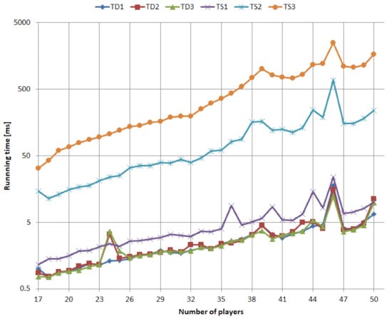 In Figure 7b we show the comparison of running times , , and of algorithms , , and for players. The running times were evaluated by repeating the algorithm execution 10 times for the same input data. They are plotted on a logarithmic scale. Observe that by far the most efficient among them is algorithm . The linear increasing trend of and on the logarithmic scale is consistent to our findings that the complexity of algorithms and is exponential with the number of tournament players. Note that this tendency is also observed on the plot of , for which the values were recorded only for an exact power of two of the number of players, i.e., . Moreover, the sub-linear increasing trend of on the logarithmic scale is consistent with the fact that algorithm has a polynomial time complexity.