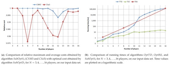 Figure 7 presents results obtained with optimal algorithms and , as well as their comparison with results obtained by sub-optimal algorithm for players, on our input data set.