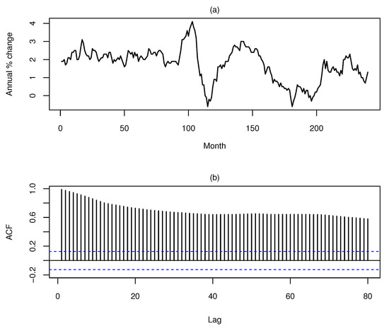 (a) Monthly data of the euro zone inflation. (b) Autocorrelation function.
