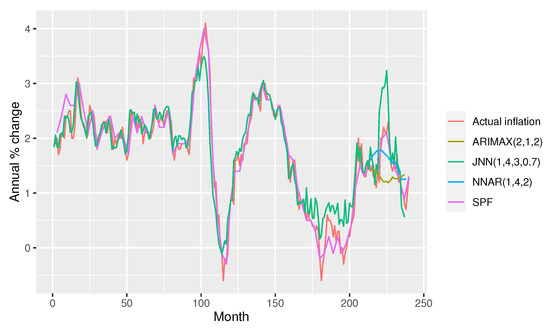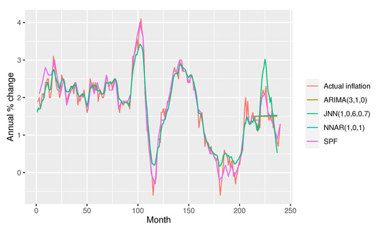 Moreover, additional exogenous inputs increase the RMSE of NNARs regardless of the number of hidden neurons. This means that the overfitting problem can be reduced when JNNs are applied with additional exogenous inputs, which is not possible to achieve with NNARs. These findings support our modeling strategy when neural networks are considered in practical applications, i.e., for forecasting purposes. This is in line with [18,38] who found that multivariate models and more variables can improve inflation forecasts, while it is opposite to findings of [24,28] favoring simpler models. The same conclusion emerges when JNNs are compared with appropriate ARIMA models. ARIMA(3,1,0) and ARIMAX(2,1,2) both exhibit very poor predictions according to Figure 2 and Figure 3, although having rather low RMSE error “out-of-sample” for models without and with the external regressors (0.452 and 0.519, respectively). Appropriate lags of ARIMA models p, d and q are selected according to information criteria AIC and BIC and whether additional regressors are considered as exogenous inputs or not. Unlike ARIMA and NNAR models, the JNN provides stable and more precise inflation forecasts. The JNN’s RMSE is somewhat higher because of the peak in the middle of the year 2018, when JNN forecasted much higher inflation than other models. In other periods the inflation forecasts were in line with the actual inflation. These findings of superiority of JNN against FNN in inflation forecasting is found in [10], while the superiority of NNs in general compared to ARIMA models are found in [17,20,26].