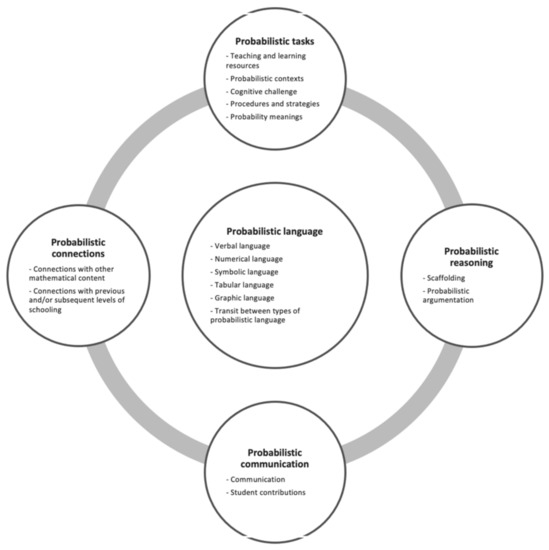This study, as noted, focuses on the “probability tasks” dimension, which includes five components: teaching and learning resources; probabilistic contexts; cognitive challenge; procedures and strategies; and probability meanings.