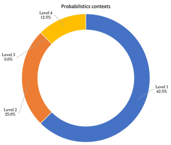 Accordingly, an analysis of the classes shows (Figure 4) that many of the teachers present probability tasks in the low and medium low levels, meaning they rely on contexts linked to random experimentation and, very anecdotally, on other contexts, especially social and personal, that are familiar to the students. However, the presence of at least one context is always observed.