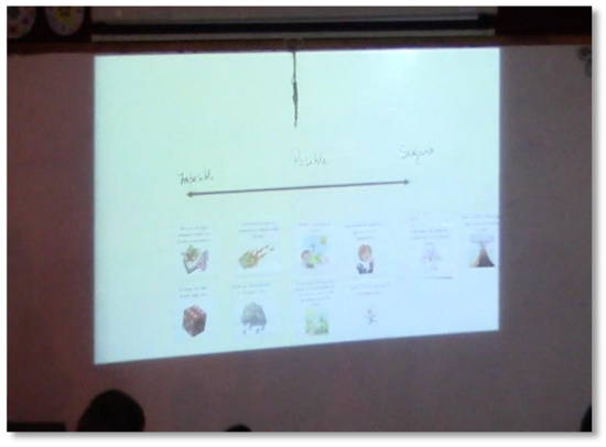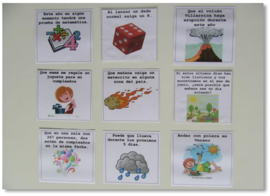 If we focus on the contexts of the probability tasks given in each grade, it shows that the fifth grade has the most context, since, to compare the probabilities of different events without calculating them, the teacher proposes probability tasks with diverse contexts familiar to the students, as well as situations that involve randomised experiments. An example of this is the activity proposed by the teacher where, using various sheets with situations involving uncertainty (Figure 5), the students must discuss their probability of occurrence by identifying varying degrees of its likelihood, ranging from impossible to certain. As a result of this discussion and based on the diversity of opinions given by the students themselves, a scale is set up that allows for qualitatively assessing the opportunities of occurrence (Figure 6), where each degree of possibility implies a different level of uncertainty.