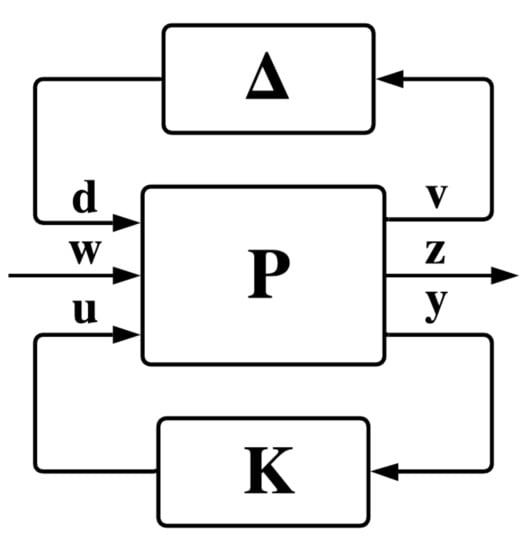 The uncertainty block is interconnected with the generalized plant via an upper linear fractional transformation (ULFT), while the controller K is interconnected via a lower linear fractional transformation (LLFT) with , as noticed in Figure 1.