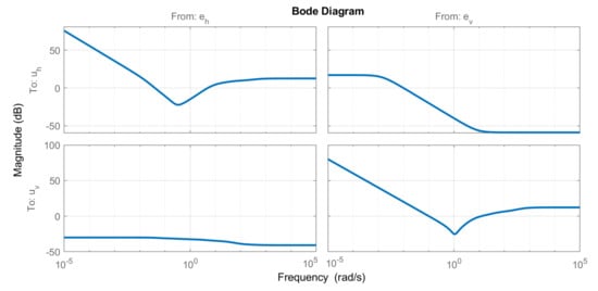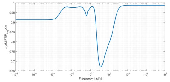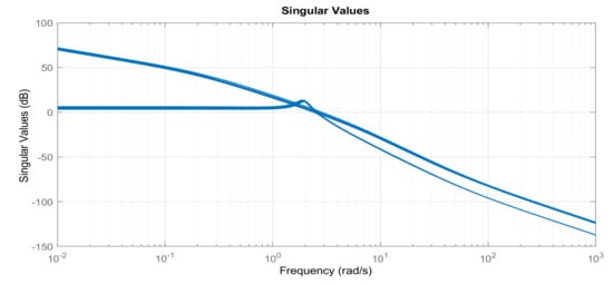 As noted in Figure 3, the frequency range is between [rad/s] and [rad/s], which will be also used for ORA, along with the order of approximation . Using the augmented plant presented in Figure 5, the fixed-structure mixed-sensitivity loop shaping -synthesis problem (25) is solved using the musyn command from MATLAB with the following specifications: the maximum number of D–K iterations is 10, the threshold for the upper bound of the is 1, and the maximum number of iterations for asserting the lack of progress is 4.