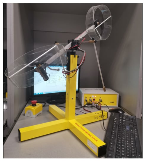The controller design procedure proposed in this paper will be applied on a twin rotor aerodynamic system (TRAS). The physical stand from INTECO [27] is presented in Figure 4. The numerical values of the parameters described in Section 3 are presented in Table 1, along with their nominal values and tolerances.