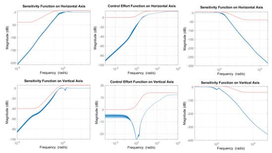 In order to illustrate the frequency-domain performance, the sensitivity function, complementary sensitivity function and control effort are presented in Figure 7. The nominal plant has been analyzed along with 100 Monte Carlo simulations for the given uncertainty range. Also, in order to underline that the control problem has been successfully solved, the weighting functions are also depicted and it can be noticed that all the simulated functions are under the imposed thresholds. Additionally, the Bode magnitude characteristics of the resulting controller are provided in Figure 8.