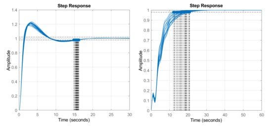 The time-domain performance of the lower linear fractional transform between the linearized plant and the controller are presented using a step response in Figure 9. In a similar manner, the nominal plant is illustrated along with 100 Monte Carlo simulations. The rise time for the azimuth position varies between [s] and [s], having a settling time between [s] and [s] and an overshoot between and , with no steady-state error. Similarly, the rise time for the pitch position is between [s] and [s], having a settling time between [s] and 19 [s], with no overshoot and no steady-state error.