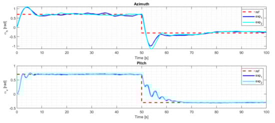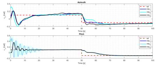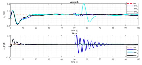The second set of experiments are made for the stabilization problem, where the reference for both axes is [rad]. It can be noticed that the azimuth position presents an initial overshoot comparable to that obtained for the linear system, while the second part of the oscillation is more aggressive, underling the influence of the nonlinear components. In a similar manner, the pitch position presents an overshoot along with several oscillations, while the settling time is comparable with the linear case’s. The experimental results are shown in Figure 11. Moreover, three different disturbances have been applied after 50 [s]: a perturbation on the vertical axis which leads the pitch position at the maximum value (blue), a perturbation on the horizontal axis with the same characteristics (cyan), and another small perturbation on the horizontal axis (black). It can be noticed that all disturbances have been successfully rejected.