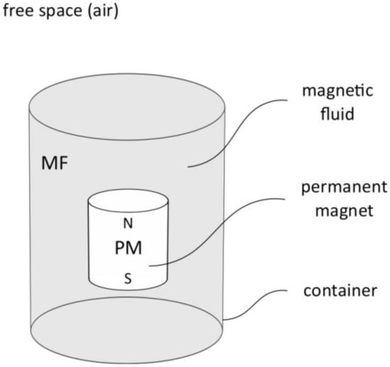 Analysis of the self-levitation phenomena associated with a PM immersed in MF depends on the engaged geometry and material properties of the solids and liquids involved [11]. This study is focused on the simple cylindrical geometry, where both the PM and the container with MF are cylindrical. Onward, the PM is placed in a closed and fully filled container in such way that both axes coincide. The basic deployment is shown in Figure 1.