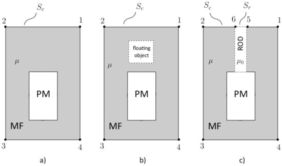 Maybe it is not evident at first, but Equation (12) gives a very useful mathematical tool. Namely, while all the physical significance of the interest, i.e., the force , is reflected through the integration over the surface bounding the MF, despite changes inside the boundary. The following illustrative examples shown in Figure 4 should give a transparent understanding of Equation (12). In the first case, labeled by (a) in the Figure, where only a PM is floating inside the liquid, force is obtained by integrating along the four Sections 1–2, 2–3, 3–4, and 4–1. Now, suppose some other object besides PM floats within the MF, as shown in Figure 4b. While the surface of the container is not affected by the additional object, the calculation of force follows the same procedure. If the setup is given as in Figure 4c, where a non-magnetic rod is attached to the PM and passes through the container, then the integration over the rod’s surface in the container’s hole should be included in the force calculation, due to the difference in the magnetic properties of the rod and the MF. The integration pertaining to the MF is performed through the paths 1–5, 6–2, 2–3, 3–4 and 4–1, while Sections 5 and 6 passes through the non-magnetic rod.