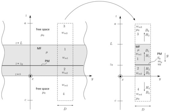 Suppose the arrangement as shown in Figure 6, which is unbounded in both and directions. The MF with constant permeability occupies the space from the reference level at to the height of the container at . The space surrounding the MF is free space or air with the permeability . Now, imagine having such a PM which has an infinitesimally small thickness and is extended extensively over the plane at the height within the MF. As indicated in Figure 6, the computational domain is divided into four sections, 1 to 4. Section 1 corresponds to the region with the MF above the PM, Section 3 announces the free space above the PM, and a similar indication is carried out for the regions below the PM, where Section 2 and Section 4 pertain to the MF and free space region below the PM, respectively. The magnetic field intensity and magnetic flux density at the PM’s surface are and , respectively, which are specified by the PM’s properties. Assuming the edges of the PM are distant from the segment of interest, then a -component of a magnetic field will dominate near that fraction of the PM. To the first approximation, an exponential decrease in the magnetic field can be assumed with respect to the vertical distance from the piece of the PM in question. The rate of change in the field is determined by another PM’s constant, . Here, the levitation height of the PM is indicated with and is taken as a parameter.