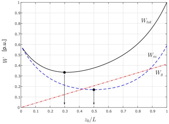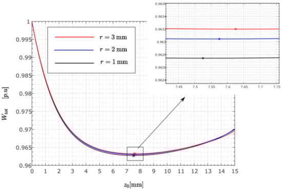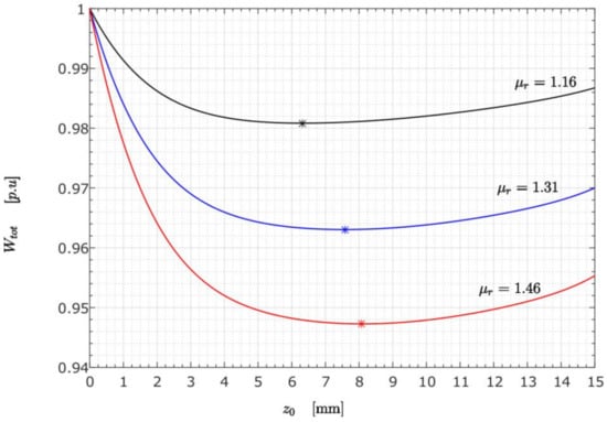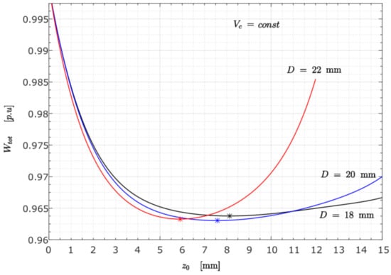 Results of a qualitative analysis based on the energy method. A stable levitation height is attained at the minimum of the total energy. The influence of the levitating object’s weight acts in the way to move the equilibrium height towards the lower value. Data used in the analysis are given as follows T, mm, mm2, mm, m−1, , mm, and mm. Each of the curves are normalized by the maximum value of the total energy.