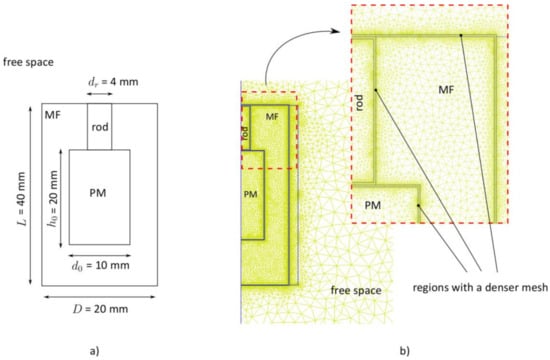 Based on the presented theory, the actual calculations were executed by the FEM-based computer program FEMM 4.2. Among others, the used FEM software is capable of handling two dimensional (2D) axisymmetric magnetostatic problems, and is a reasonable choice for launching such numerical effort. The dimensions and FEMM model of the problem in preprocessor mode are shown in Figure 9. The right side of the Figure shows the regions with finer mesh, and those regions pertain to the integration paths used with the SIM. The mesh density is chosen automatically by the FEMM 4.2 code, and it is constrained by the maximal mesh size defined by the user. Not shown in Figure 9, the computational domain is enclosed with a 100-mm radius of free space.