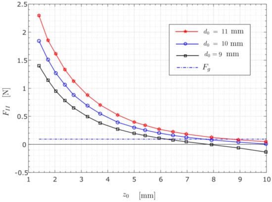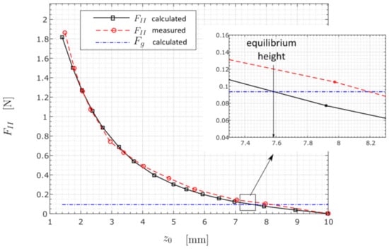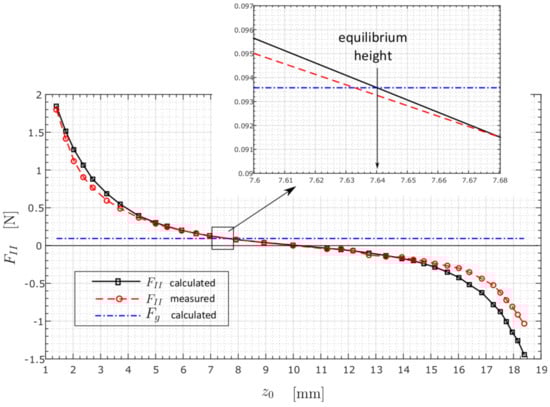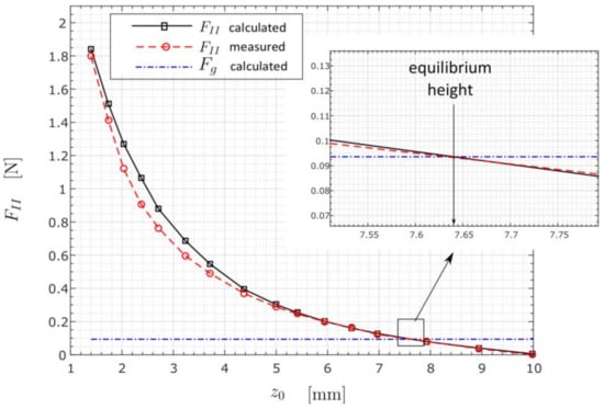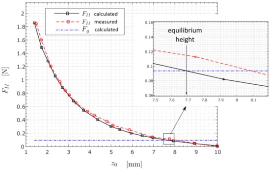 However, suppose that the influence of the rod attached to the top of the PM can somehow be eliminated from the measurements while it is a part of the measurement device which measures the force (dynamometer). Then, by knowing the second-order buoyancy force , the equilibrium height or stabile levitation state of a permanent magnet is determined by finding an intersection point between the gravitational force of the PM in the MF, , and . With respect to the calculated values, the equilibrium height of the PM for the case study corresponds to mm. The intersection is drawn in Figure 10 (the intersection between and ). Gravitational force is calculated as the weight of the PM subtracted by the weight of the displaced fluid for a given example N.