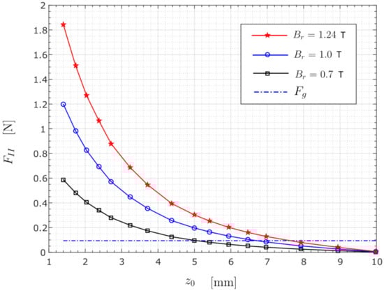 Variation of the PM’s remanent flux density and its influence on the PM’s equilibrium height is studied here. The values of were set as follows: T, T, and T. Other relevant parameters used with the analysis were mm, , mm, mm, mm, and mm. The mesh parameters were the same as in the ones stated in Table 1. The results of the analysis are collected in Table 5 and presented in Figure 18 and Figure 19.