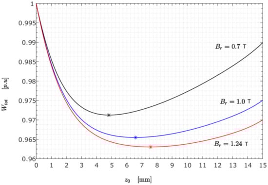 The PM’s equilibrium height calculated by EM. The results are shown for three different values of the PM’s remanence, i.e., T, T, and T, respectively. The minimum value on the individual curve is indicated with the Asterisk (*). Each of the curves were normalized by its maximum value.