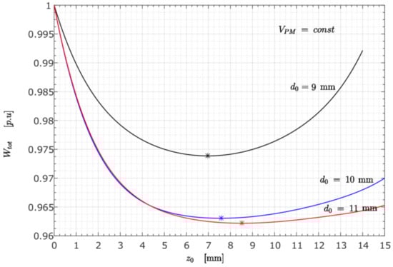 The PM’s equilibrium height calculated by EM. The results are shown for three different values of the PM’s diameter, i.e., mm, mm, and mm, respectively. The minimum value on the individual curve is indicated with the Asterisk (*). Each of the curves was normalized by its maximum value. In the calculations, the PM’s volume remained un-changed.
