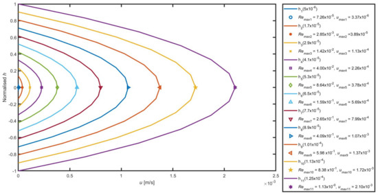 Eleven channel thicknesses are selected to study the tracer–plate interaction effect on velocity profile. The displacement pressure gradient and viscosity are set to be 500 kg/s and 0.000464 kg/ms. To illustrate the effect of linear drift on the tracer propagation profile at pore scale, flow in parallel plate of dimension mm was considered. Flow velocities in different directions as determined from the solution of Equation (3) as a function of channel thickness are computed. The maximum velocity patterns as a function of channel thickness were analysed based on Reynolds number in order to compare different flow regimes.