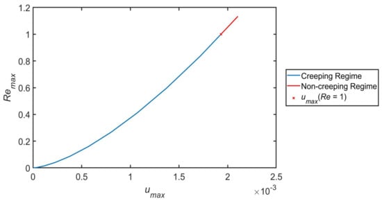 Maximum Reynolds () number as a function of maximum velocities ().