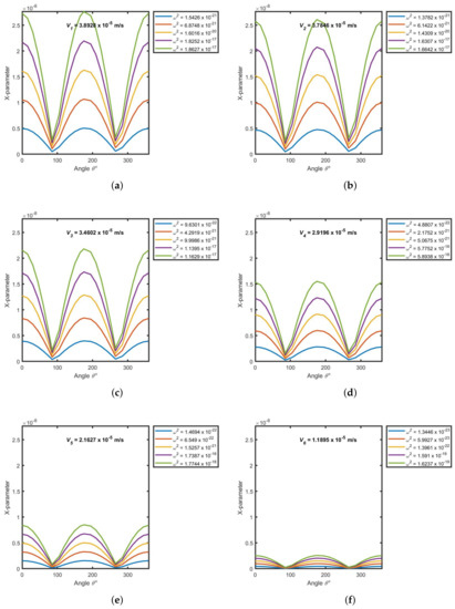 (a–f). X-parameter as a function of angle at a thickness of , time and varying separation constant . For each channel thickness shown in Figure 3, eleven (11) symmetric velocity data points are generated, and each data point used in the computation of X-parameter profiles. Due to the symmetric nature of the velocity profiles, only half-wing of the plane; consisting of six (6) data points, is presented here. The data for the other half-wing is presented in Appendix F.