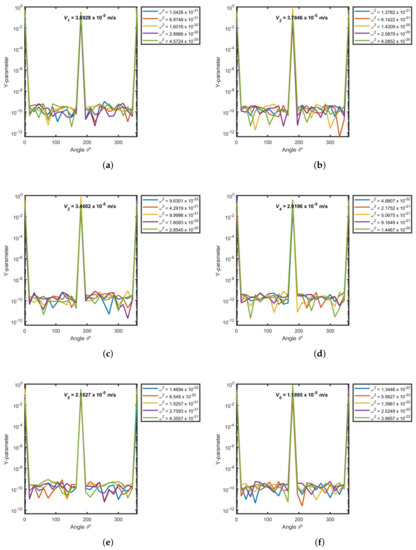 (a–f). Y- parameter as a function of angle at a thickness of m, time and varying separation constant . For each channel thickness shown in Figure 3, eleven (11) symmetric velocity data points are generated, and each data point used in the computation of Y-parameter profiles. Due to the symmetric nature of the velocity profiles, only half-wing of the plane; consisting of six (6) data points, is presented here. The data for the other half-wing is presented in Appendix F.