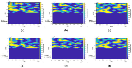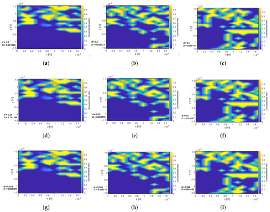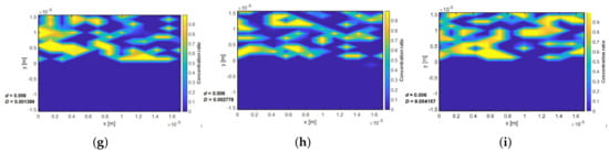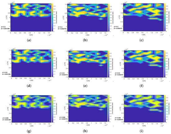 Considering the river-like nature of linear drift, radial flow as well as convection in every direction, the transformation from the polar ( radial) coordinate to Cartesian coordinates is given as and . However, for instantaneous injection, the concentration of the tracer in the pore is known during the tracer test study; therefore, the solution for can be obtained by solving Equation (17) within the porous system. Several numerical inversion scheme are available for solving Equation (21) such as Euler inversion [29,30], Gaver–Steehfest algorithm [31,32] or Talbot inversion algorithm [33]. The Euler inversion algorithm was used for the numerical inverse Laplace operation in the numerical code used in this work. Flow velocity of the system is an important parameter. The flow of tracers within a carrier fluid depends on the velocity of the system and is modelled by considering a creeping flow in a heterogeneous system. Anisotropic porosity distribution was developed using the random probability density function (PDF) allowing for non-uniform velocity to be calculated. Typical normalised channel thickness as a function of velocities for various ranges of scales is shown in Figure 3 with different channel heights and Reynolds numbers.