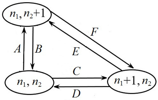 It follows that the process defined in the graph on Figure 2, also satisfies these equations. Thus, a model of a queuing network with failures is constructed that satisfies the product theorem. If , then the constant H is defined by the equality