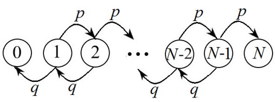 Consider queuing system with a service intensity and the intensity of the input flow Here is defined by Markov chain describing a game to ruin the player [17], with the states and The process with the states is Markov. Denote such queuing system by